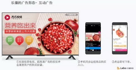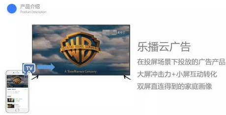 OTT行业最有趣的大屏互动广告,广告跟随人走。居于乐播投屏SDK在电视大屏和手机APP中大量覆盖,每一次投屏,在电视上SHOW完广告后,同类广告会同时间在手机端出现下单购买入口,解决电视只看不卖的转化难问题。第二,当前电视播放广告之后,只要连接了此wifi与电视建立过联系的手机,在以后的时间中,就可以在手机各类手机应用中看到广告,因为电视会告诉你,这个用户已经被宣传一次了,现在你可以引导他购买。根据这个原理,还可以衍生出更多可玩的互动游戏。因为手机和电视都可以参与广告运营。这种可玩性更强了。