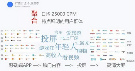 理解更深一点,投屏广告是指在投屏场景下,在手机与电视两个载体中产生的广告场景。核心优势就是大屏冲击力+小屏互动转化能力强;通过双屏打通,让电视与手机建立连接关系,从而帮助OTT行业得到真实的家庭用户画像。