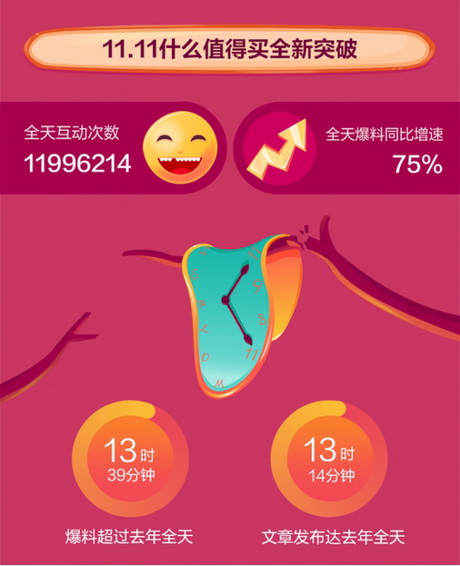 今年“11.11”当天,什么值得买互动量达到11996214次,用户爆料相比去年同期增长69%,仅13小时39分钟爆料数量就超过了去年全天;“11.11”当天文章发布量,仅用13小时14分钟就和去年全天持平。