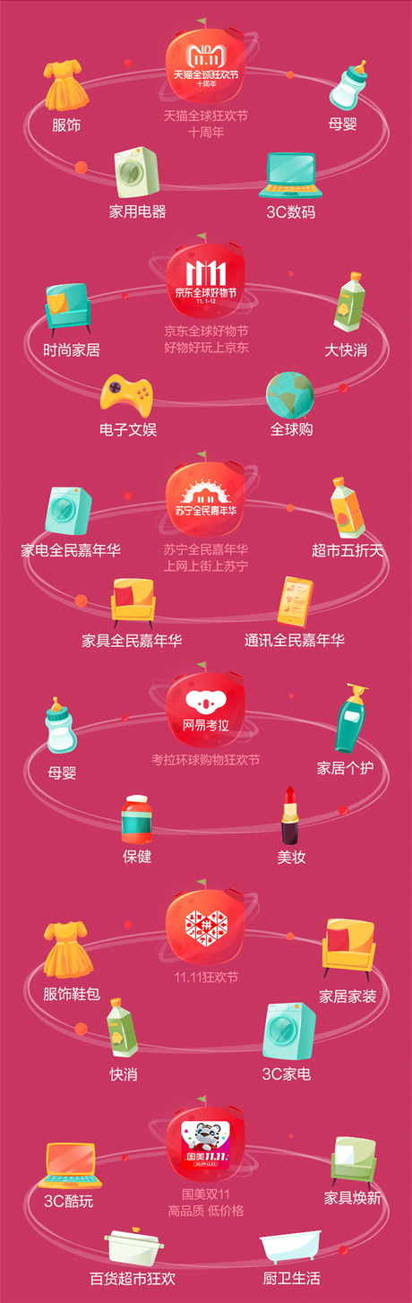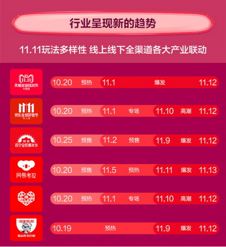 纵观行业趋势,今年适逢“11.11”十周年,天猫以“全球狂欢节十周年”为slogan,主题涉及服饰、家用电器、3C数码和母婴。京东以“11.11京东全球好物节-好物好玩上京东”为slogan,主打时尚家居、电子文娱、全球购和大快消。此外,苏宁易购主打家电、家居、通讯全民嘉年华和超市五折天;网易考拉主打母婴、保健、美妆和家居个护;社交电商黑马拼多多从10月28日开启预热狂欢,“11.11”当天迎来颠覆之夜的高潮,12日至16日开启惊喜返场;国美以“国美11.11高品质 低价格”为slogan,主打3C酷玩、百货超市狂欢、厨卫生活和家具焕新,最终在11月9日至11日迎来爆发。