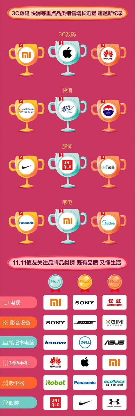 3C数码、快消等重点品类销售增长迅猛:3C数码品类中,苹果、小米、华为最受消费者钟爱;清风、尤妮佳、茅台是最受欢迎的快消品牌;优衣库、NIKE、茵曼在服饰品类中表现不错;家电品类中,小米、松下、美的成为该品类的佼佼者。