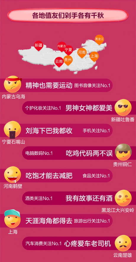 因不同地域人群的不同的生活习惯和方式,不同地方的值友们“剁手”的产品品类也不尽相同:来自内蒙古乌海的值友最关注图书音像类;来自新疆吐鲁番的值友都爱美,因此个护化妆类关注第一;来自宁夏石嘴山的值友最关注的是手机类;来自贵州铜仁的值友最关注的是电脑数码类;来自河南鹤壁的值友最关注食品类;来自黑龙江大兴安岭的值友最爱喝酒;来自上海的值友喜欢旅游;来自云南楚雄的值友最关注的是汽车消费类。
