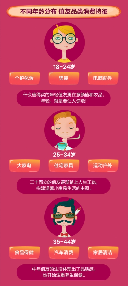不同年龄层的值友们也呈现明显的消费特征:18-24岁的年轻值友更在意颜值和衣品;25-34岁三十而立的值友更关注大家电、住宅家具和运动户外,构建温馨的小家;35-44岁的中年值友在意生活品质,注重养生保健,最关注食品保健、汽车消费和家居清洁。