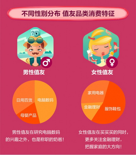 消费特征在男女性别上差异更加显著:男性值友最爱的当然少不了电脑数码,也关注母婴产品和日用百货,在研究电脑数码的兴趣之外,也是称职的奶爸呢;女性值友的关注自然有服饰鞋包,也更关注家用电器和金融理财,把握家庭的大方向。