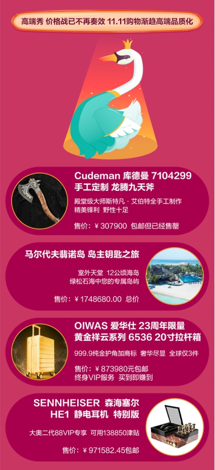 价格战已不再奏效,“11.11”购物渐趋高端品质化:库德曼手工定制龙腾九天斧售价达30万,且已经售罄,因为是殿堂级大师斯特凡·艾伯特的全手工制作,精美锋利,野性十足;高达174万的私人专属岛屿—马尔代夫翡诺岛,可以在12公顷的海岛享受室外天堂;亦或是价值7万元的爱华仕23周年限量黄金祥云系列拉杆箱,全球仅3件,提供终身VIP服务;以及森海塞尔HE 1静电耳机特别版,比平时便宜近14万后售价仍高达97万,88VIP专享的贵族耳机。
