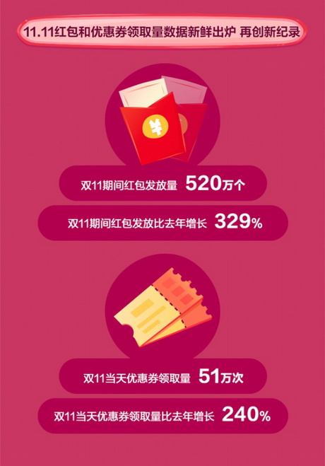 “11.11”最吸引大家的买买买的优惠券怎么能少? “11.11”期间共领取520万个红包,比去年增长329%;“11.11”当天优惠券共领取51万次,比去年增长240%,均创造了新记录。