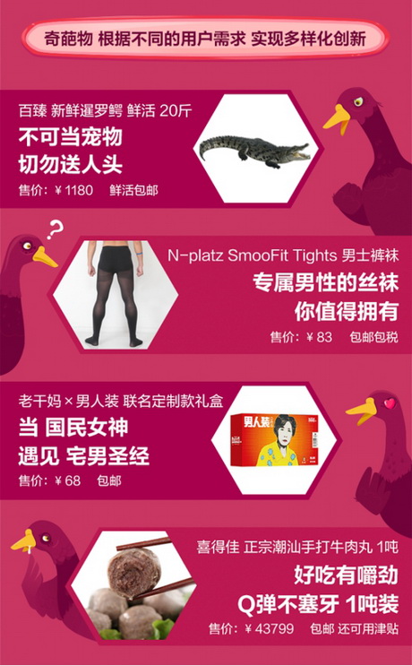 在什么值得买,“11.11”期间当然少不了奇葩物和高端秀。今年的奇葩物从不同的用户需求出发,实现了多样化创新:重达20斤的百臻新鲜暹罗鳄,不能拿来当宠物哦;老干妈和男人装推出了联名定制款礼盒,“国民女神”遇上“宅男圣经”会擦出怎样的火花?丝袜只有女性穿?男士裤袜打破你的认知;喜得佳正宗潮汕手打牛肉丸好吃有嚼劲,Q弹不塞牙,1吨装,家里是开餐厅的,还是有矿啊。