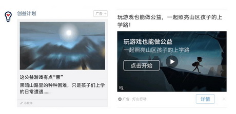 这是“我是创益人”大赛第一个公益小游戏广告,也是第一个尝试QQ浏览器调起微信小程序功能的公益广告。截止到11月18日24:00,这支公益爆款小游戏已经收获了逾84万次访问、12500次分享。小游戏最终筹得的善款将由中国志愿服务基金会为江西遂川县珠田乡修建沿路200盏太阳能路灯。