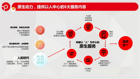 在人的时代,消费者和品牌在对的生活场景中产生有效链接是品效合一的最优方法,基于人在生活场景中的洞察产生的原生内容,是驱动整合营销的最有效基石和出发点。所以,从原生营销到原生动力,将品牌战略、营销策略、原生内容产出、全媒体应用、自媒体互动有机整合,并促进线上电商及线下终端销售,达到品效合一。