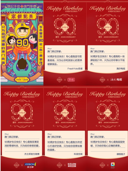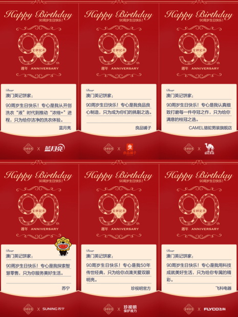 澳门英记以“专心才酷”为主题,联动超过10家蓝V品牌共同发布结合自身品牌调性的贺卡海报,为庆生造势,同时也为品牌增加了话题热度,突出体现了90周年活动主题。