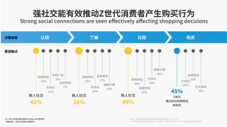 根据凯度和QQ广告共同发布的《Z世代消费力白皮书》,在Z世代感知品牌、了解品牌、比较同类型产品和发生购买行为的消费决策全流程中,社交媒体始终是他们赖以获取信息的重要渠道。