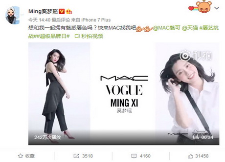 在明星背书方面,微博向来是明星和粉丝互动的主阵地,70%的明星使用微博长达七年以上,明星月活粉丝占微博月活用户的一半以上,明星话题年总阅读量高达6898.1亿次。微博充分挖掘明星IP的商业潜力及明星粉丝传播力,实现明星效应向粉丝群体的最大化延伸,不断为品牌玩转粉丝经济奠定基础。知名超模奚梦瑶在微博上参与的M·A·C#唇艺挑战#吸引大量粉丝关注,带动66450支唇膏火速售罄,是双十一高端口红第一名的三倍,带货力MAX,助力品牌实现出色的销量转化。