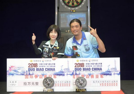 12月2日,由中国飞镖协会主办,北京夺镖体育文化有限公司承办,广州亚美信息科技有限公司冠名赞助的“2018车智汇中国飞镖公开赛暨夺镖中国·软式飞镖职业赛(广东-广州站)”在经过两天的激战后于广州体育学院圆满落幕。在决赛中,来自中国香港的名将韩世昌连扳五局、反败为胜以6:5战胜来自广东的潜力新星占清宇获得男子组冠军,并获得10万元奖金。女子组桂冠则由来自山东烟台的“中国飞镖第一美女”周莫默摘得,她以5:0大比分战胜来自香港的名将孙蔚婷获得了大赛的第二个分站赛冠军,并获得3.5万元奖金。在最受关注的国际争霸赛环节,职业赛男女组冠军韩世昌、周莫默分别对决国际传奇镖手丹尼斯·普里斯特里和约翰·劳,女子组冠军周莫默先是战胜国际传奇镖手约翰·劳,最终周莫默巾帼不让须眉,再度爆冷以5:1大比分战胜韩世昌夺冠,并获得10万元奖金,成为中国飞镖史上首位"双冠女王"!