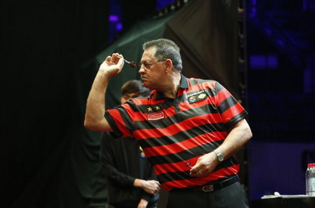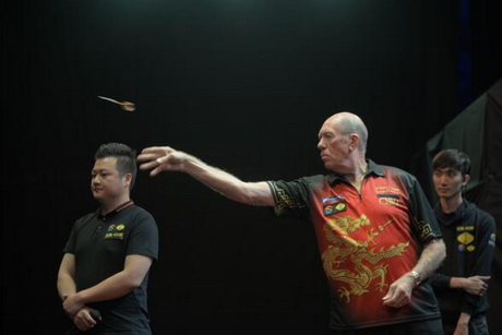 夺镖体育董事长李冉(左)与世界传奇镖手丹尼斯·普里斯特里(右)为男子组冠军韩世昌颁奖(中)