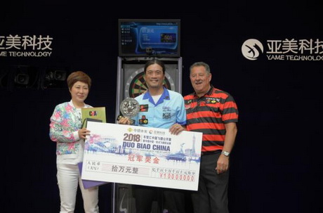 亚美科技董事长江勇(左)与世界传奇镖手约翰·劳(右)为女子组冠军周莫默(中)颁奖