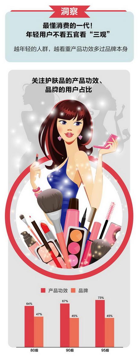 年轻用户更加注重产品功效而非品牌,对于产品选择更看重本质。绝大多数的女性消费者都有这一特点,但在年轻群体中更加明显,七成95后消费者表示功效比品牌更重要。