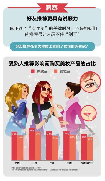 而当进行到购买决策阶段,强关系链更能促进美妆消费的达成,六成以上人群会因为熟人推荐而决定购买,特别是在一线城市,七成以上的消费者会因朋友/家人推荐而购买。