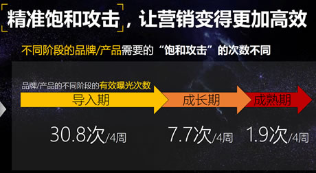 而研究也发现,在不同阶段,需要的有效曝光次数也不同,其中在产品的导入期,需要约30.8次/4周,到成长期也需要7.7次/4周的频次,即便是在成熟期也需要约1.9次/4周的频次。