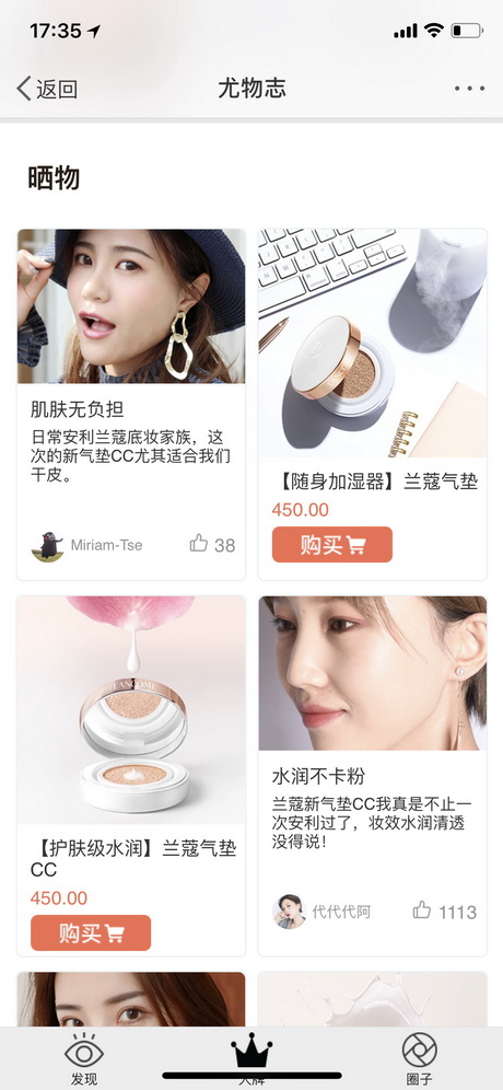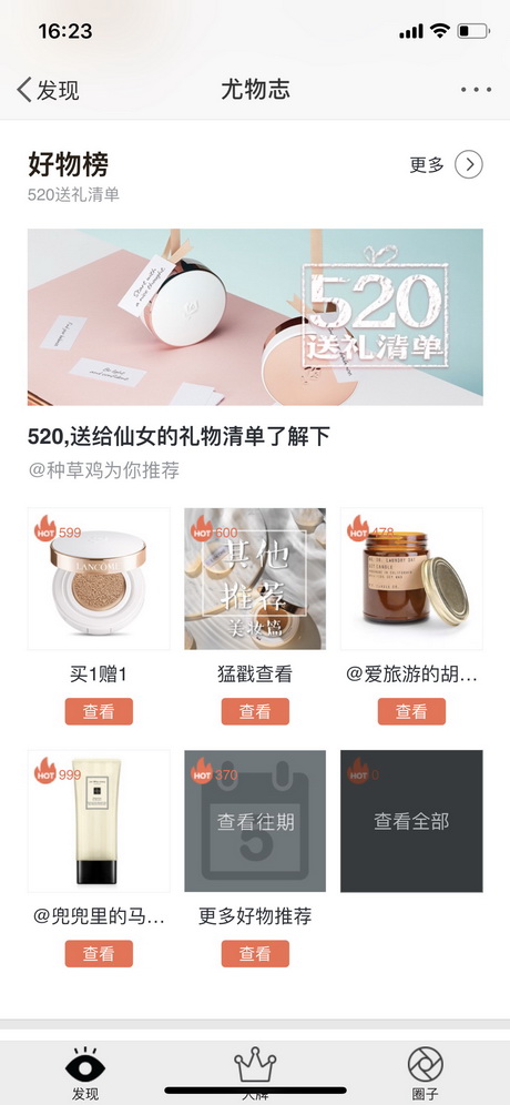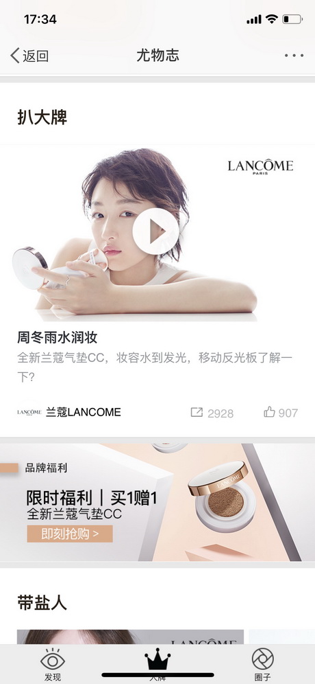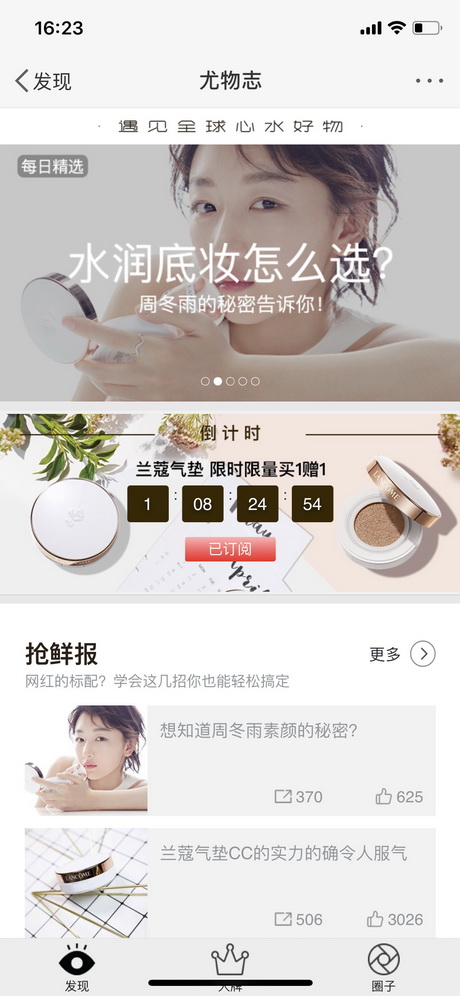 发现页三大栏目,美妆达人多角度热议,让气垫安利有内涵。大牌页包场,全方位深度解读,兰蔻吸睛指数飙升。代言人周冬雨及兰蔻官方联合领衔,秒懂明星水润底妆秘密。