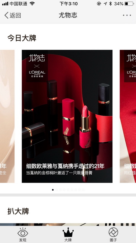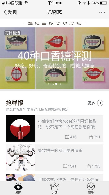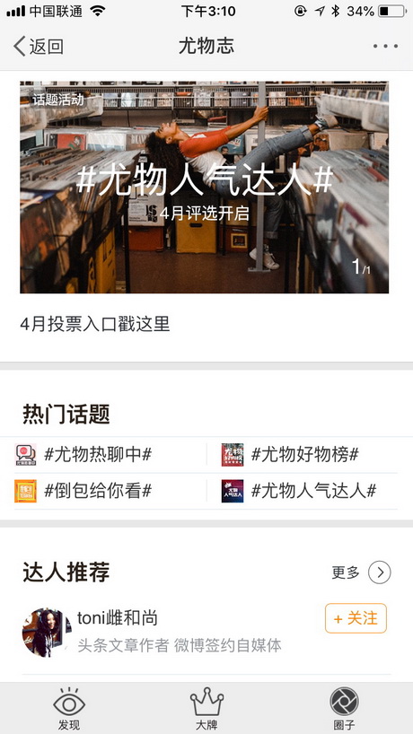 目前,尤物志聚集了对潮流文化和时尚前沿感兴趣的一二线城市年轻用户,相关话题阅读量近20亿,近千位合作达人、机构为尤物志每周生产优质内容。此外尤物志更在微博发现页广场页核心位置拥有一级入口。2018年,尤物志频道升级,三大底导Tab“发现”、“大牌”、“圈子”全新改版上线,搜罗各类好物、好品牌,在用户心中植入美好生活方式消费指南的初印象。“发现”以抢鲜报、好物榜、热聊中三个栏目为载体,聚合头部达人和机构的优质内容,和频道联动,打造内容电商新生态。“大牌”集合日签海报、扒大牌视频、带盐人、必败款和体验师、晒图等版块形成品牌360度多媒体说明书,深度解读优质品牌。“圈子”汇聚有趣的达人、话题和活动,是好物种草社区;年内更将升级为UGC社区,全面提升用户粘性。