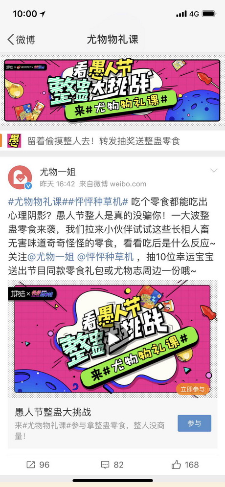 此外,尤物志基于当下流行热点,整合站内站外的多种运营资源,专业达人kol的鼎力支持和推广,加上尤物志的互动定制,许多重大节点的热点活动由此应运而生,全链路无缝隙导航,智造品牌热点传播事件。在“新年心愿单”活动中,罗晋、马思纯等多位明星拍摄短视频助力活动,为用户种草并号召用户晒出自己的新年心愿单,活动参与人次超过200万。 愚人节 #尤物物礼课#的#整蛊大挑战#项目,尤物志迅速抢占愚人节营销热点。期间,@尤物一姐发布原创整蛊好物盘点视频,收获4000万+阅读量,#整蛊大挑战#话题阅读量也迅速破亿。