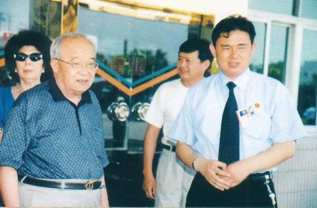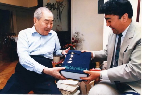 ▲1995年4月,原曲阜市文管会主任孔祥林向孔子第七十七代嫡长孙孔德成赠送孔府家酒。