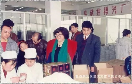 ▲香港演艺明星沈殿霞来曲阜酒厂参观并品尝孔府家酒。