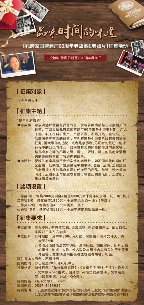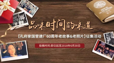 2018年,将迎来孔府家国营建厂60周年。为了共同分享大家的陪伴与喜悦,我们决定用一次温情还带精美奖品的方式,面向孔府家的所有粉丝征集“孔府家国营建厂60周年老故事&老照片”。
