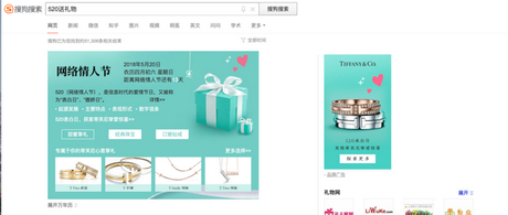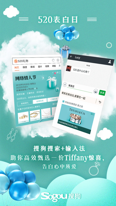 520期间,蒂芙尼借助“表白日场景”,联合搜狗进行了节日整合营销。将品牌信息植入与“520、礼物”等关键词相关的搜狗搜索、搜狗输入法等优势入口,为恋人送礼、表白支招言爱的同时,提升蒂芙尼品牌曝光度。