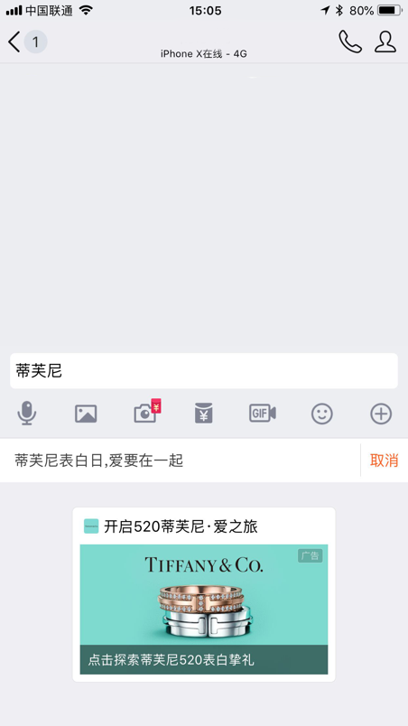 蒂芙尼分析了与自身品牌和产品相关的多个消费动机,结合用户的不同需求场景,以及节日时间、消费人群特性、以及产品特点等多维度因素,制定数十个触发关键词。成功覆盖了多元消费场景和购买诉求,所以用户只要输入相关触发关键词,就会自动接收到蒂芙尼的智能分享卡片。