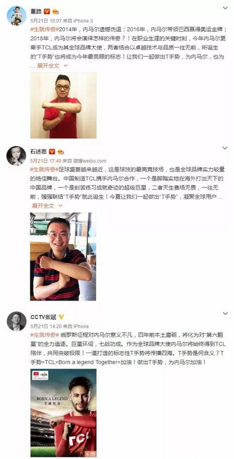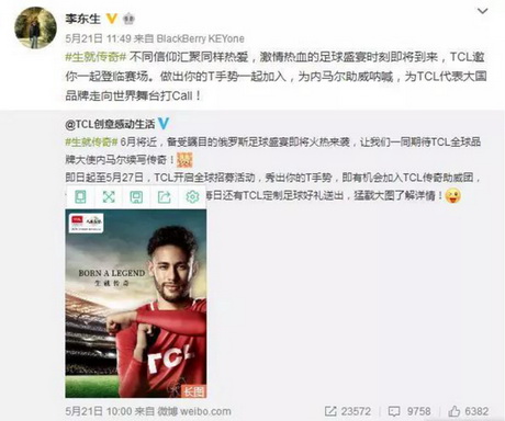 5月21日,@ TCL创意感动生活 官微首发#生就传奇# TCL传奇助威团招募活动,号召全球球迷一起,为内马尔的俄罗斯之行助威,TCL集团股份有限公司董事长、CEO李东生率先在微博上互动回应,随后,TCL其他高管以及全球8万名员工共同参与,提升了员工自豪感及品牌价值认同感。