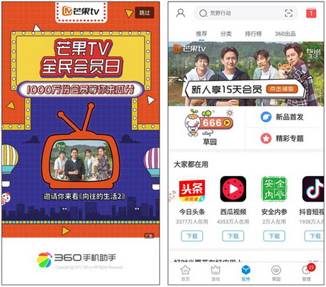 5月以来,芒果TV与360手机助手合作,借助《向往的生活2》的火热开播,在手助的开屏页面、软件页面等重要位置,以“新人享15天会员”、“1000万份会员等你来瓜分”的会员福利对用户进行“甜蜜诱惑”,利用“精彩好剧+会员福利”成功地吸引了更多真爱粉注册参与,“转身”成为新的VIP会员。据了解,360手机助手与芒果TV合作进行VIP会员推广以来,芒果TV的VIP会员数量有了可观的增长。