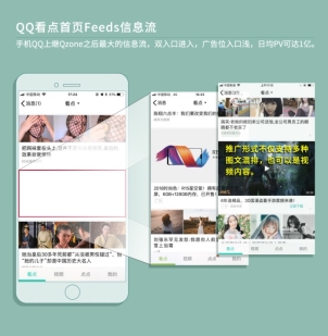 QQ看点首页Feeds信息流:手机QQ上继Qzone之后最大的信息流,双入口进入,广告位入口浅,日均PV可达1亿。推广形式不仅支持多种图文混排,也可以是视频内容。