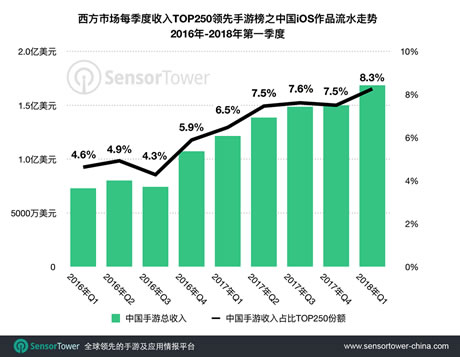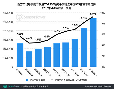 根据移动营销分析平台Sensor Tower的最新数据显示,今年一季度,国内手游在西方iOS市场创下新高。 国产手游iOS下载量在今年一季度占西方市场份额9.2%,同比增长55%。西方市场收入Top250榜单中有24部国产手游,占整体榜单总收入8.3%,吸金总量约1.7亿美元。