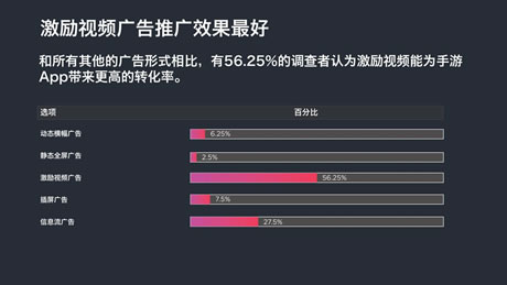 图注:来自YouAppi《2018中国手游广告报告》显示,56.25%的调查者认为激励视频广告能为手游App带来更高的转化率