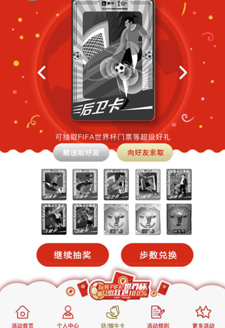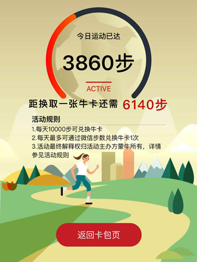 在过去3个月的集卡活动中,除了扫码获取牛卡,消费者还能通过微信运动来获得牛卡。每走10000步可兑换一张牛卡,每个用户每天最多可兑换牛卡一张。微信运动步数换卡机制让用户不再只是一条窝在沙发上看比赛的咸鱼,激励用户跟着世界杯的足球小将一起动起来!乳制品所主打的“健康”形象与微信运动天然契合,品牌通过激励消费者多运动,使得蒙牛“健康”形象更加深入人心。