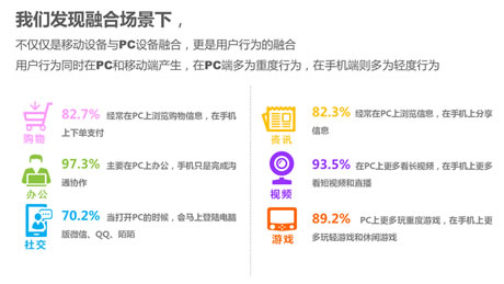 营销的核心是用户。当谈到融合时代下的用户特征时,张旻翚说:“当下用户在使用互联网的时候,遇到需要比较沉浸、高质量的使用场景时,用户会选择PC。所以PC的使用场景不可忽视。PC是重要的办公设备,移动端满足临时、轻量级的需求,随着用户工作和生活界限的进一步弱化,PC和移动的融合将更频繁。‘一景多屏’已成为用户普遍的状态,PC与移动不是此消彼长的替代关系,而是融合发展的互补关系。”