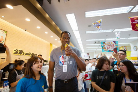 活动当天,大卫·罗宾逊刚一露面便引来了球迷们的阵阵欢呼,在现场恭候多时的主持人美娜也热情地为他献上了康师傅冰红茶与NBA联合推出的总冠军限量礼盒,还授予了这位两届NBA总冠军得主“明星顾客”称号。远道而来的大卫·罗宾逊受到如此礼遇自然十分开心,对总冠军店内的一系列精心布置赞不绝口。