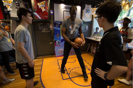 以两届NBA总冠军得主的身份亲自来总冠军店“打卡”,大卫·罗宾逊在接下来一系列互动中的表现令人刮目相看,简直像是回到了自己的主场。主持人和球迷们的各种“套路”都难不倒他。无论是辨识人民币面额购买特定产品,还是用现学的中文与球迷们互动都不在话下。几位现场球迷还有幸获得了这位传奇巨星切磋了球技。虽然退役多年,他给球迷们亲身示范时的一招一式,风采丝毫不减当年。
