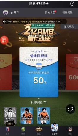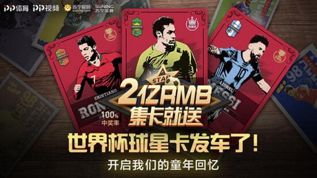 世界杯期间,PP体育推出了球星卡活动,用户不仅可在集卡过程中回忆童年玩球星卡的快乐,还可以通过集卡来兑奖。球星卡活动打通苏宁体系内的PP视频、苏宁易购、苏宁金融和PP体育等多款APP。