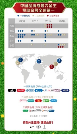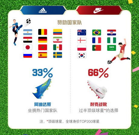 在本届世界杯上,两大体育用品巨头毫无悬念地争夺营销战场。身为FIFA长达20年的老牌赞助商,阿迪达斯共赞助了12支国家队,在球队数量上占优,并且囊括了赛前呼声较高的德国队、阿根廷队、西班牙队,另有东道主俄罗斯队。相比较而言,虽然耐克仅赞助了10支国家队,数量上少于阿迪达斯,全球身价TOP200球员有66%穿着耐克球鞋。