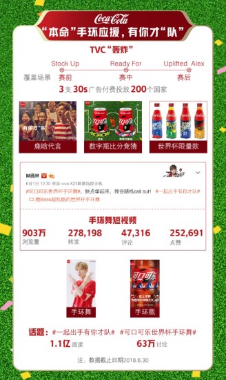 体育赛事中的品牌营销从来少不了饮料行业的身影。今年世界杯可口可乐主打互动参与,传承其以往的营销手段在瓶身做“文章”,为产品瓶身设计融入球迷应援和比分竞猜的元素,即球队花纹手环和数字;另外,在世界杯之前,可乐连投3支广告,预设了可乐在世界杯比赛前中后三种场景中的不可或缺,使消费者产生购买冲动。