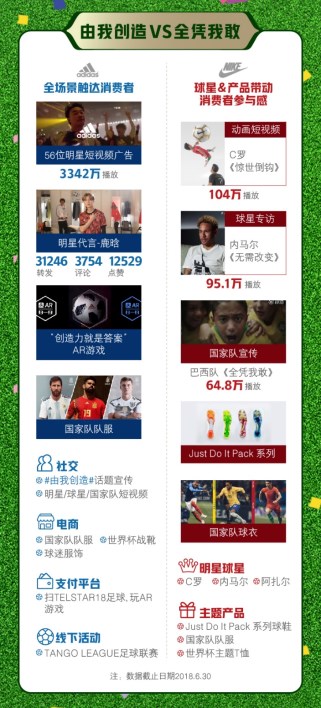 在营销策略方面,二者各有所长。阿迪达斯借助官方渠道传播优势,全场景触达消费者,用户无论在社交平台、电商、支付平台或线下,都可以体验或参与到营销活动中;邀请大量明星集体发声,通过56位明星的世界杯广告短片,以及鹿晗、迪丽热巴等流量明星的代言发声,带来了大量的曝光和讨论。