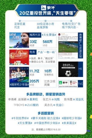 作为世界杯官方赞助商,中国知名奶制品企业蒙牛今年打出一套“组合拳”,通过社交、电商、硬广及线下等多渠道进行营销。足球巨星梅西代言、旗下多品牌联动、多明星为品牌宣传造势等形式,在微博热炒#天生要强#话题,收获33亿阅读量;除此之外,蒙牛携88位足球少年奔赴俄罗斯,通过江苏卫视《蒙牛-踢球吧!少年强》节目记录中国世界杯少年队的奋斗历程。