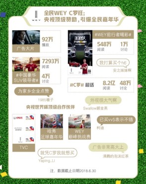 本届世界杯上,长城WEY邀请到超级巨星C罗拍摄广告,并制造话题和进行线下主题活动,把代言人价值发挥到极致。借助#C罗#超级话题,引爆自有话题#WEY前行者喝彩#、#中国豪华SUV领导者#等,分别获得548万和7293万阅读量,以及不俗的讨论量;此外,长城、哈弗和WEY都成为央视顶级合作伙伴,为品牌带来大量曝光。C罗不仅为品牌带来声量和用户互动量,也为品牌和产品带来了正面关注。