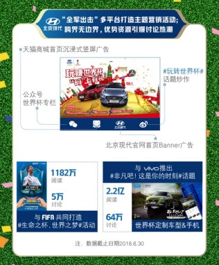 现代则集结多平台联合出击,专注一个营销活动,将用户注意力集中在世界杯定制车型、购车优惠和世界杯周边赢取活动上,并且大胆跨界合作,获得大量关注。官网、天猫商城、微信公众号、微博,等渠道共同发力,同时联合FIFA足球、vivo,共同推出#生命之杯,世界之梦#和“非凡吧!这是你的时刻”等话题,收获总阅读量超2亿,讨论近70万的营销效果。