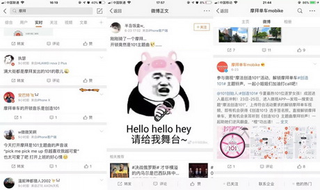 之所以选择让《创造101》与摩拜合作,智美互动是经过一番调研与考量的。在他们看来,与摩拜这种共享单车TOP级品牌合作,有利于夯实《创造101》的综艺地位,营造一种强强联合的跨界氛围。另一方面,摩拜的用户多是年轻的80、90后群体,与《创造101》的受众人群有着高度的重合,对节目知名度和话题讨论度的延展,有着不可忽视的作用。尤其是挑选在决赛当天上线,更需要这种方式来助推节目热度。