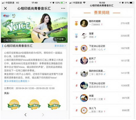 历时3个月的赛程,线上线下双管齐下,让更多的年轻人能在不同的渠道去参与,让消费者以更多维的视角去认识和感受心相印,纸尚青春,真正做到了。其中酷狗K歌大赛开始于4月24日,历经30天赛程,收到作品数万首,参与程度与传播广度可谓深刻广泛。
