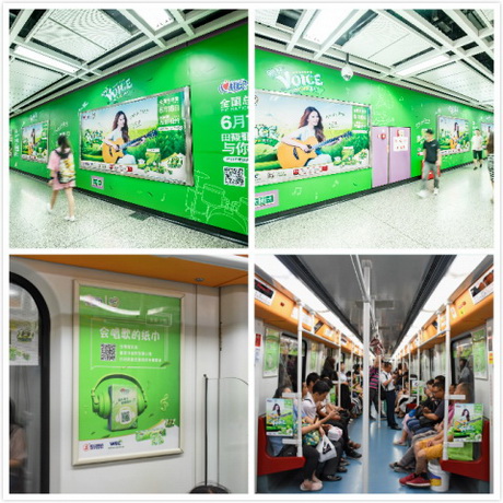 其中户外投放方面,品牌方选取人流量最大的城市交通工具广州地铁进行赛前宣传。心相印包下数个流动量最大的地铁站张贴海报,多条线路的站台灯箱纷纷有印上了活动宣传灯牌。车厢内,则布置整列的活动小海报与宣传单。此一举在初期就收到了粉丝的热烈反馈,并在微博上与心相印官方微博形成有趣的互动,心相印微信公众号顺势而出用推文宣传地铁站推广海报,捕获大量粉丝的后台留言,并纷纷前往海报点打卡。