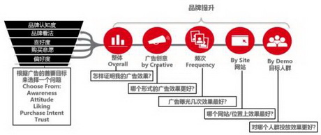 尼尔森准备了一套简单却很实用的评估方法,分为4步,挑选-问卷-测量-提升。首先从品牌认知、品牌看法、喜好、购买意愿和忠诚度五个主要营销目标中选择一个,然后通过在线问卷的方式对曝光组和非曝光组进行调研,测算两组各自的提升效果,最后就可以根据结果进行优化。